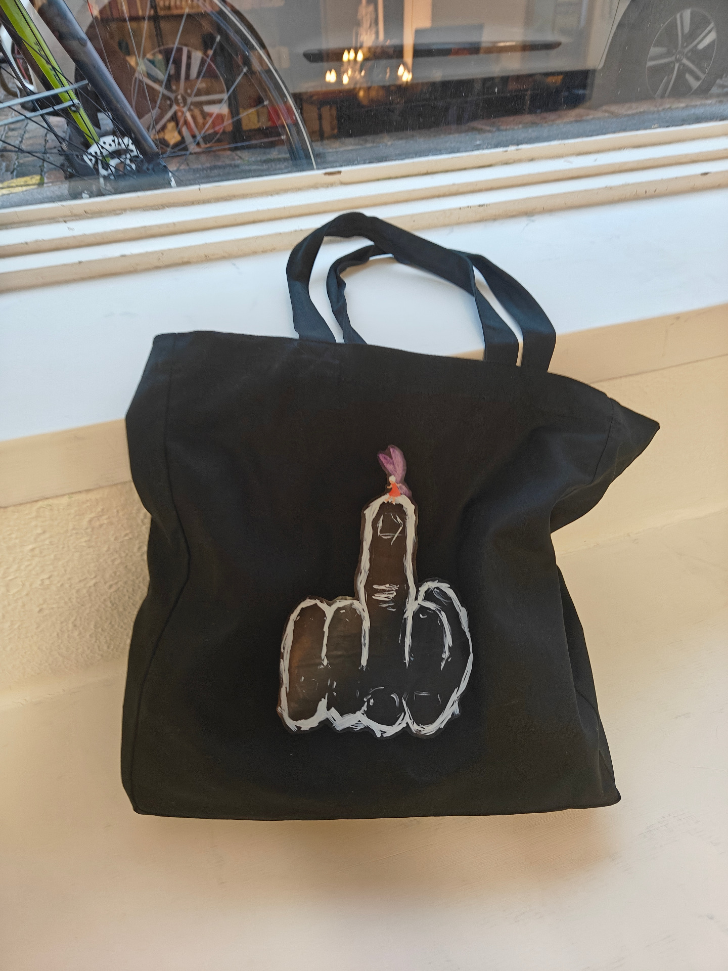 Teos syntyi korona-aikana, yksinäisyyden ja turhautumisen keskellä. Kiukun hetkellä kankaalle ilmestyi keskisormi – suora, voimakas ele kaikelle ärsytykselle ja eristyksen tunteelle.